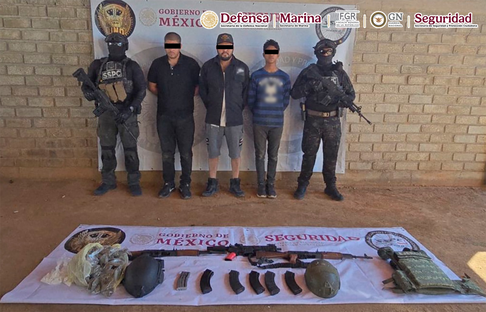 En otra acción, en Navolato, en el poblado Las Trancas, se detuvo a seis personas, les aseguraron nueve armas largas, 26 cargadores, ocho chalecos tácticos, siete pares de placas balísticas, cinco vehículos, tres de ellos con reporte de robo y dos motocicletas.